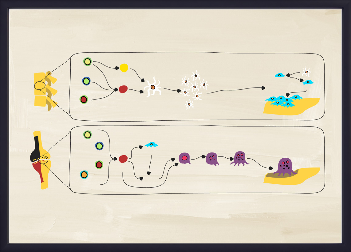 In axSpA, the inflammatory processes and new bone formation take place in the entheses, axial skeleton, and peripheral joints via the cytokine pathways, which are only just starting to be understood.1 Data suggests that bone erosion and new bone formation in axSpA may occur simultaneously at different anatomical sites, with IL-17 playing a complex role in these immune-mediated processes.2